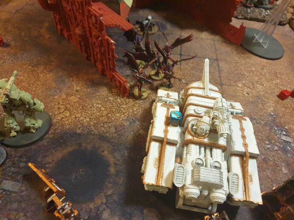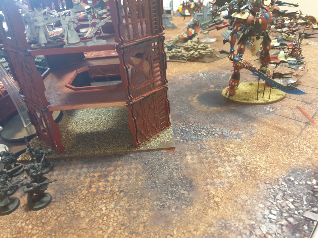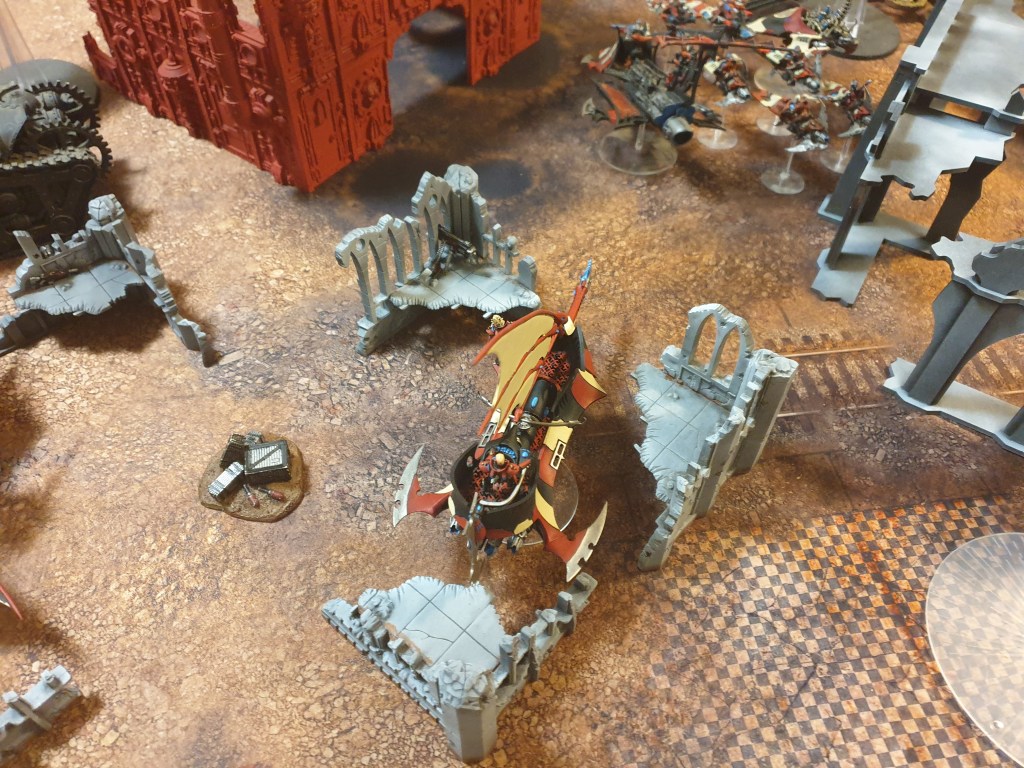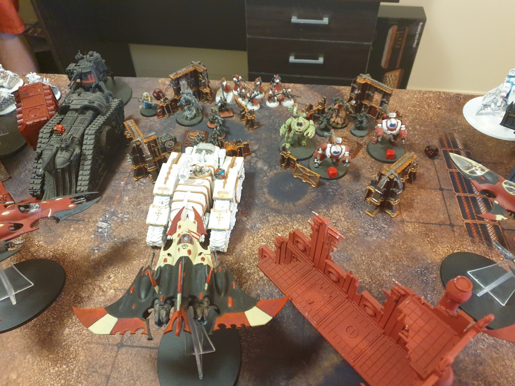 The Thanatar, a Warglaive, Breachers, Rangers and a Vulturax all deploy in the cover of the Administratum building. The Laser-crawler deploys just outside.
