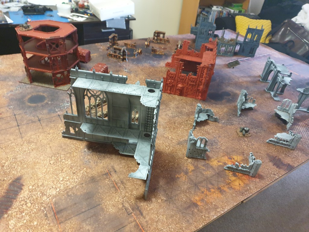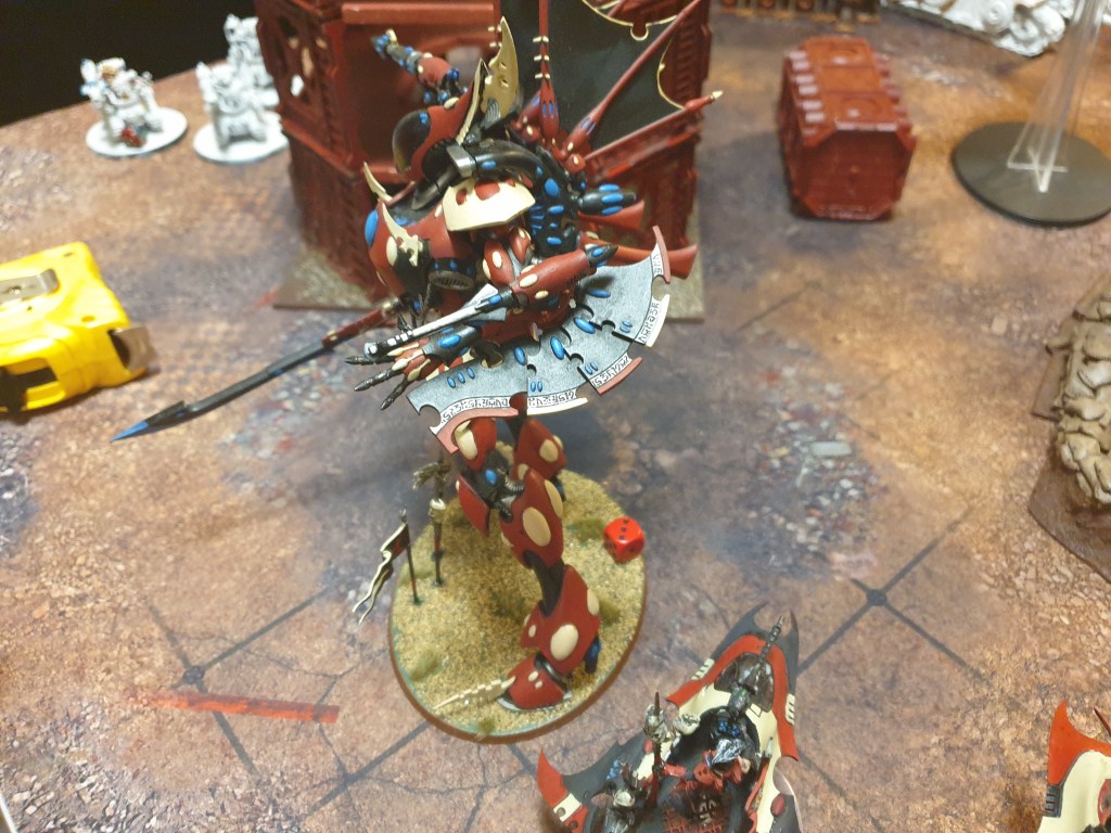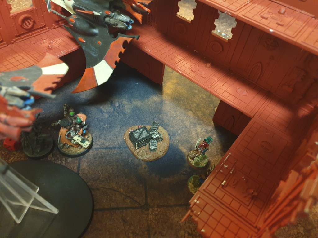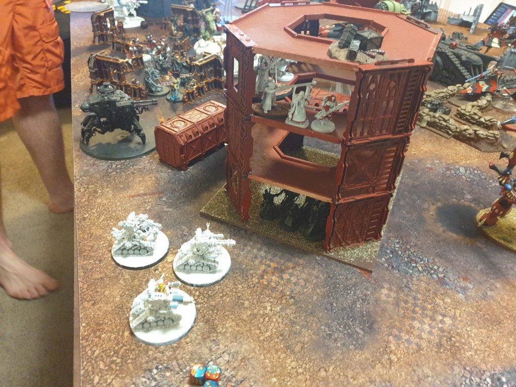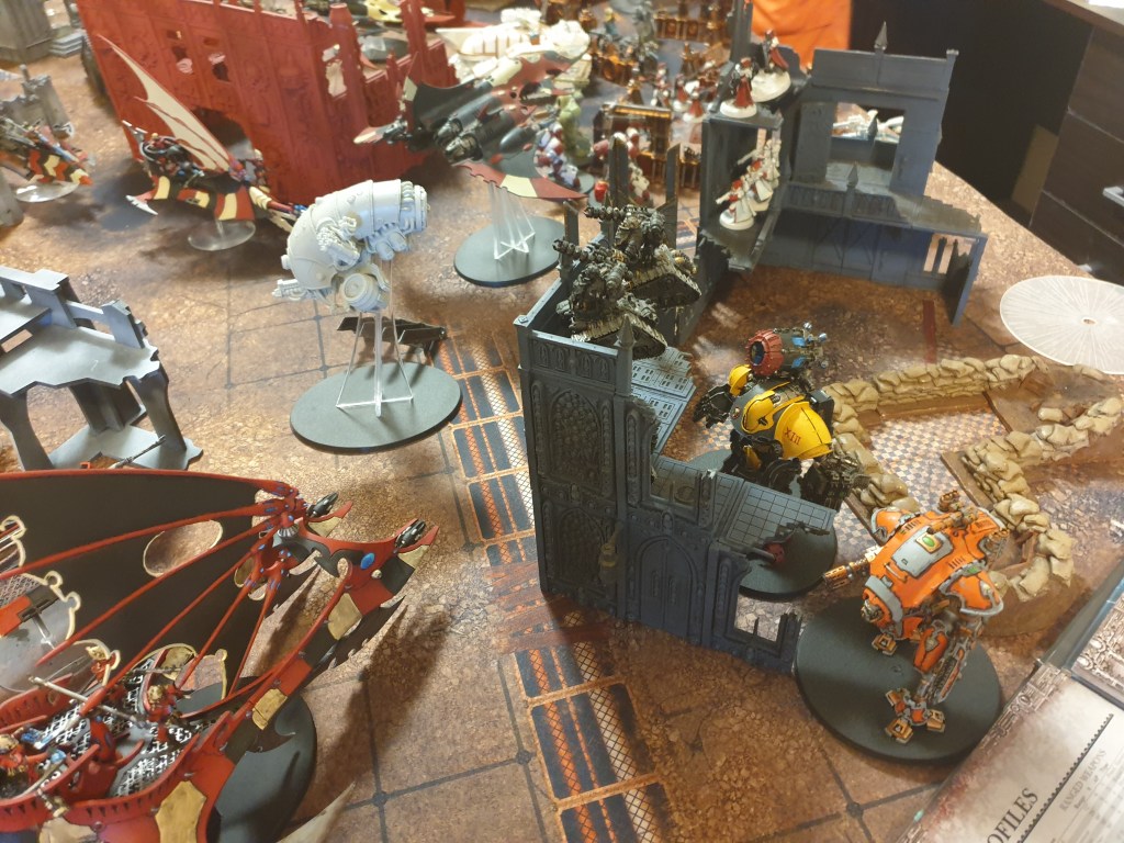 The Thanatar, a Warglaive, Breachers, Rangers and a Vulturax all deploy in the cover of the Administratum building. The Laser-crawler deploys just outside.