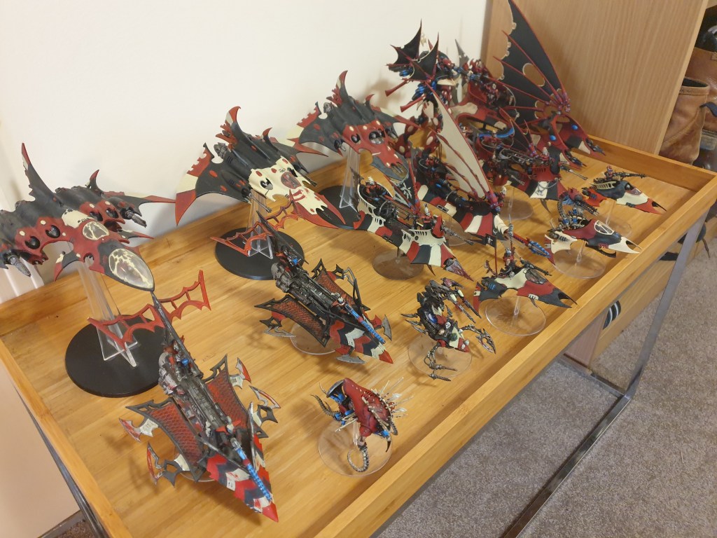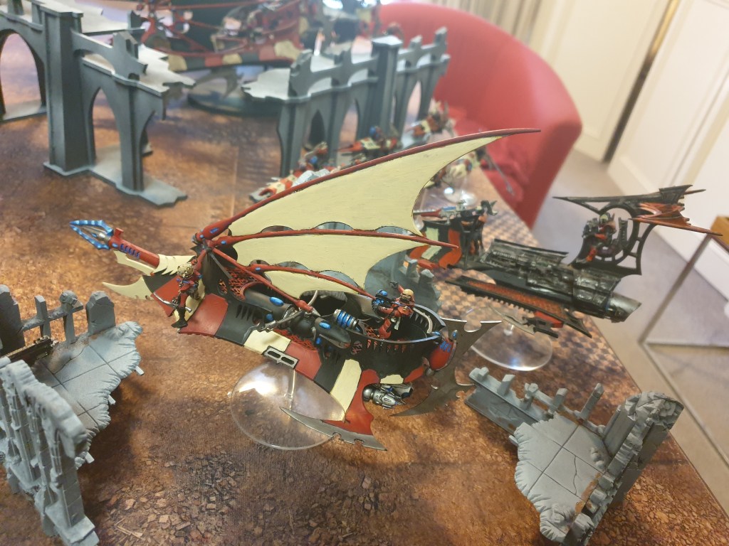The kabal forces, led by the Archon Khirareq Bloodscream and the Dark Artisan Skyrex Plunderheart. Consisting of a core of Kabalite Warriors, Trueborn and Wyches, and backed by the flesh toys of the Haemonculus covens and fast moving mercenaries. All mounted in lightning fast transports, followed by Ravagers, flyers and the reaver Wraithknight Crow.