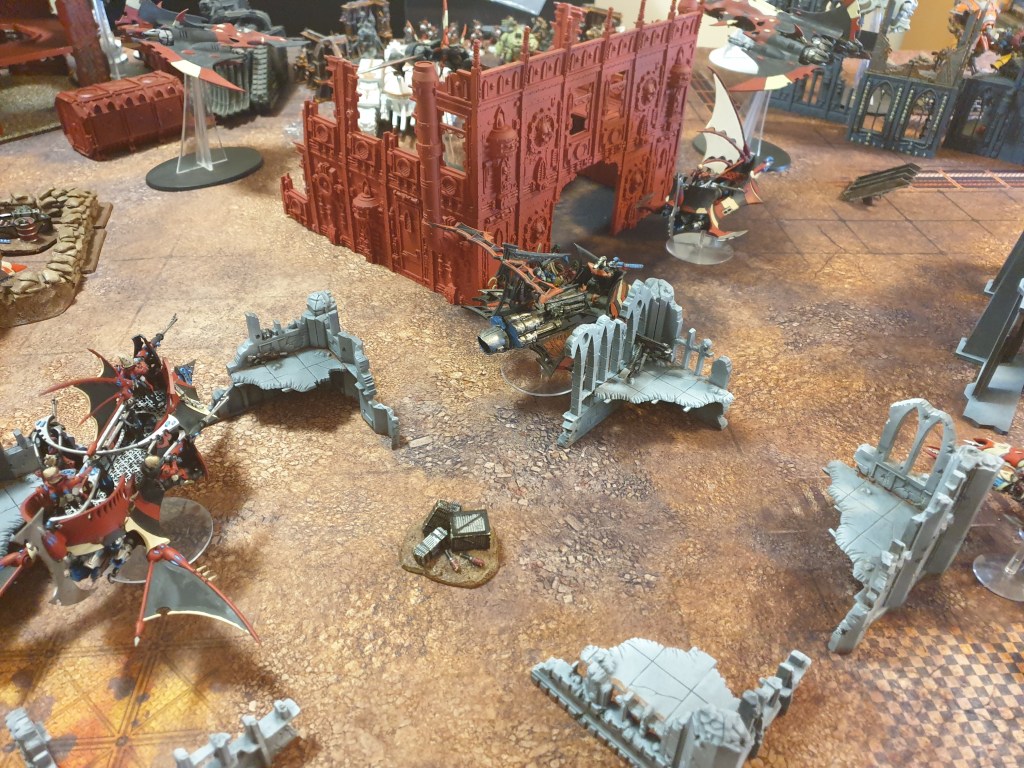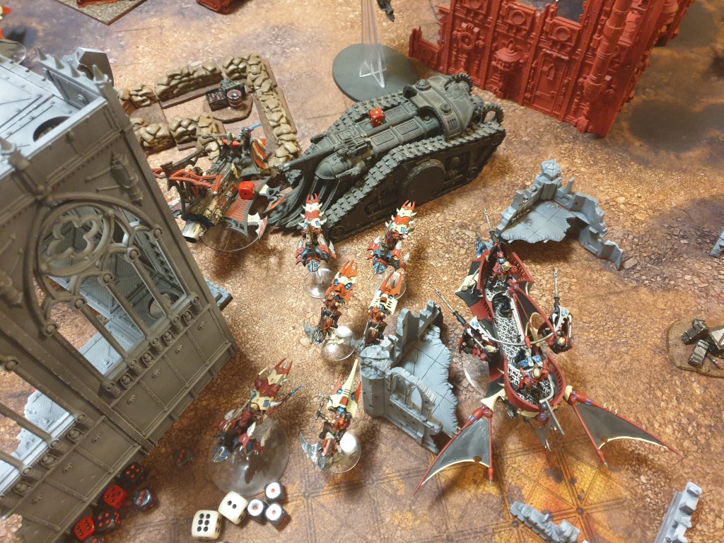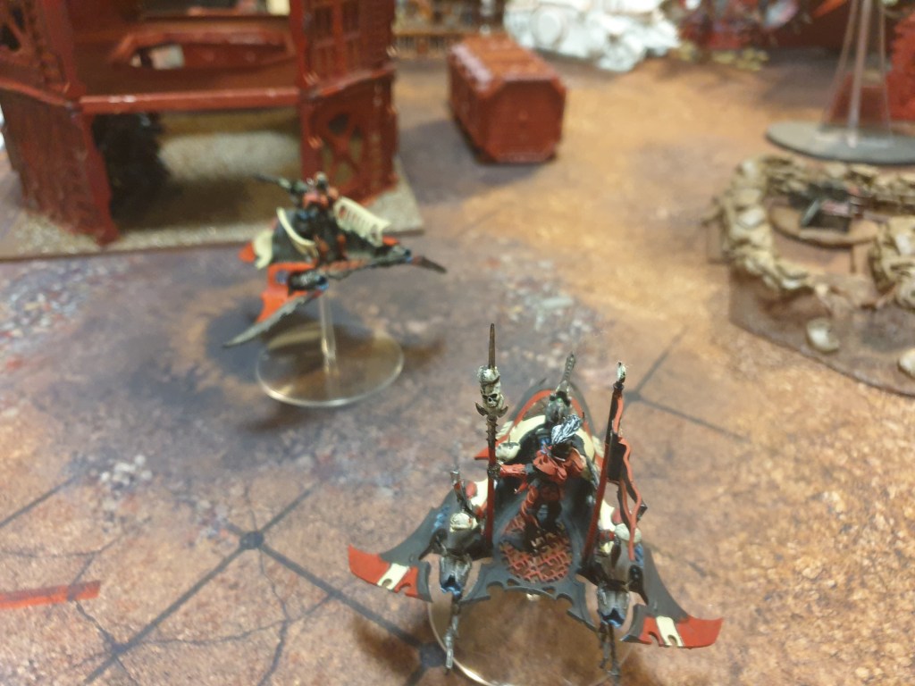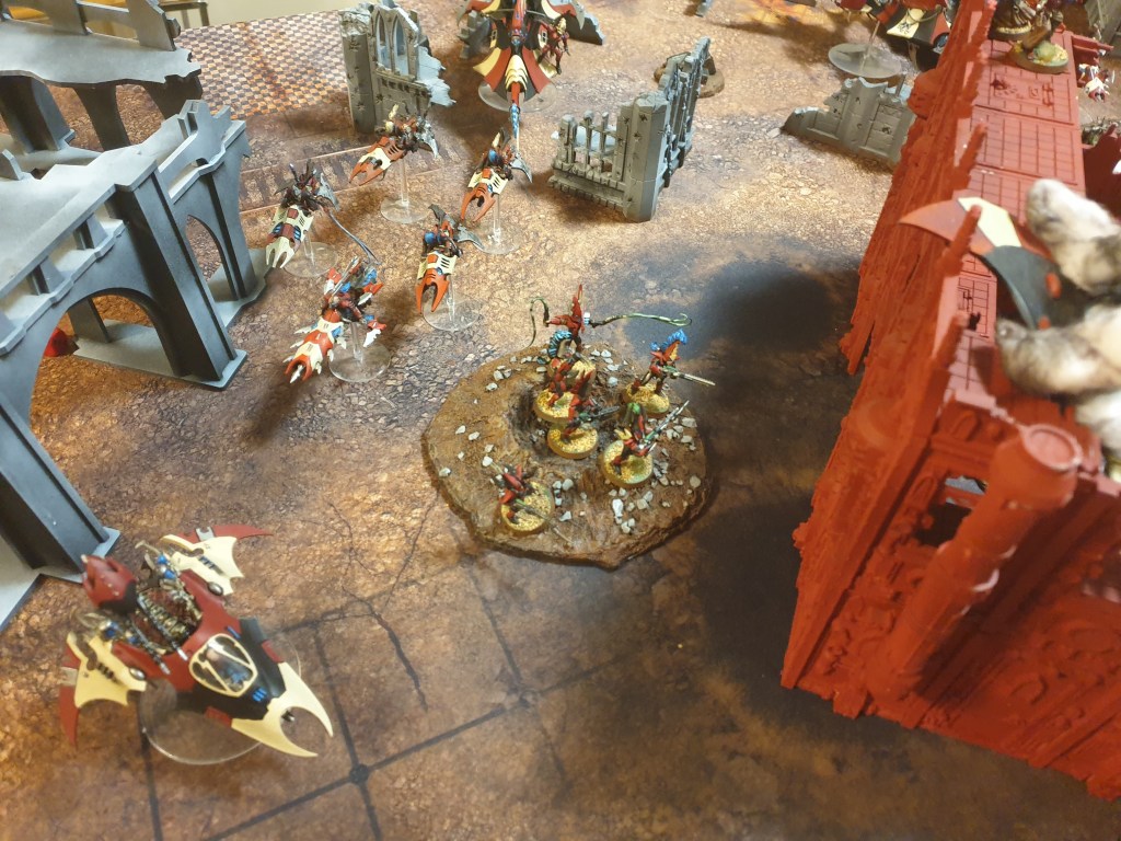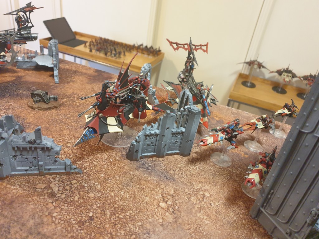 The Ravager, a Raider-bound Warrior squad and a squad of Reavers take the ruins in the centre.