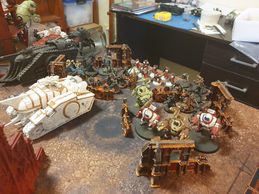 The Mechanicum force, filled out with the Kataphrons, Kastelans, Vulturaxes and specialists of the Cult Mechanicus, including a hulking Thanatar. Backing the robots is a large force of Skitarii with Dunecrawlers and transports providing armoured support. Leading the force is Masterov himself inside a Cohort Cybernetica, as well as his Dominus underlings. Finally two Armiger Warglaives are supporting the force.
