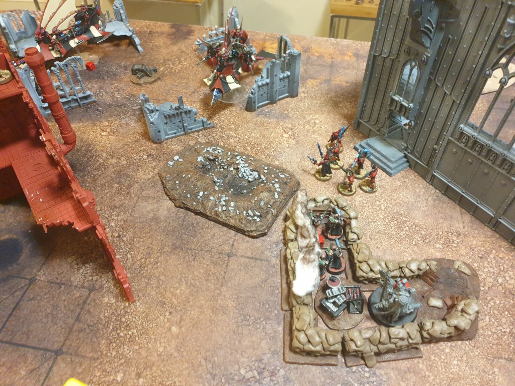 The Tantalus ‘Red Thirst’, packed out with Wyches, takes the Sanctum. Deploying in cover behind are the Venom-bound Wracks and Bloodscream with his Grotesque bodyguards in a raider.