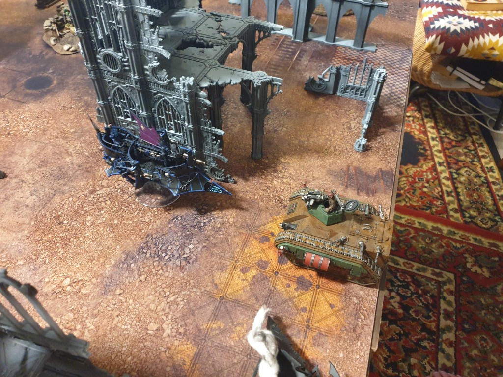 The chimeras, holding the hive gangers, bullgryns and priests, outflank into the midst of the raiding force.