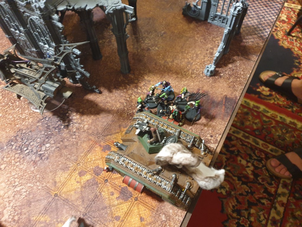 The kabal wrecks the chimera, and the bullgryns are pinned in the open.