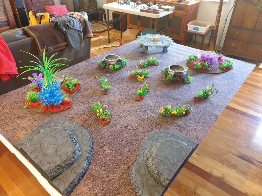Tyranoc’s force deploys in the canyon, with battle tanks, veterans and marines taking firing positions on the high ground. The venator takes the centre inside the forcefield array, lending cover to Tyranoc’s warband.