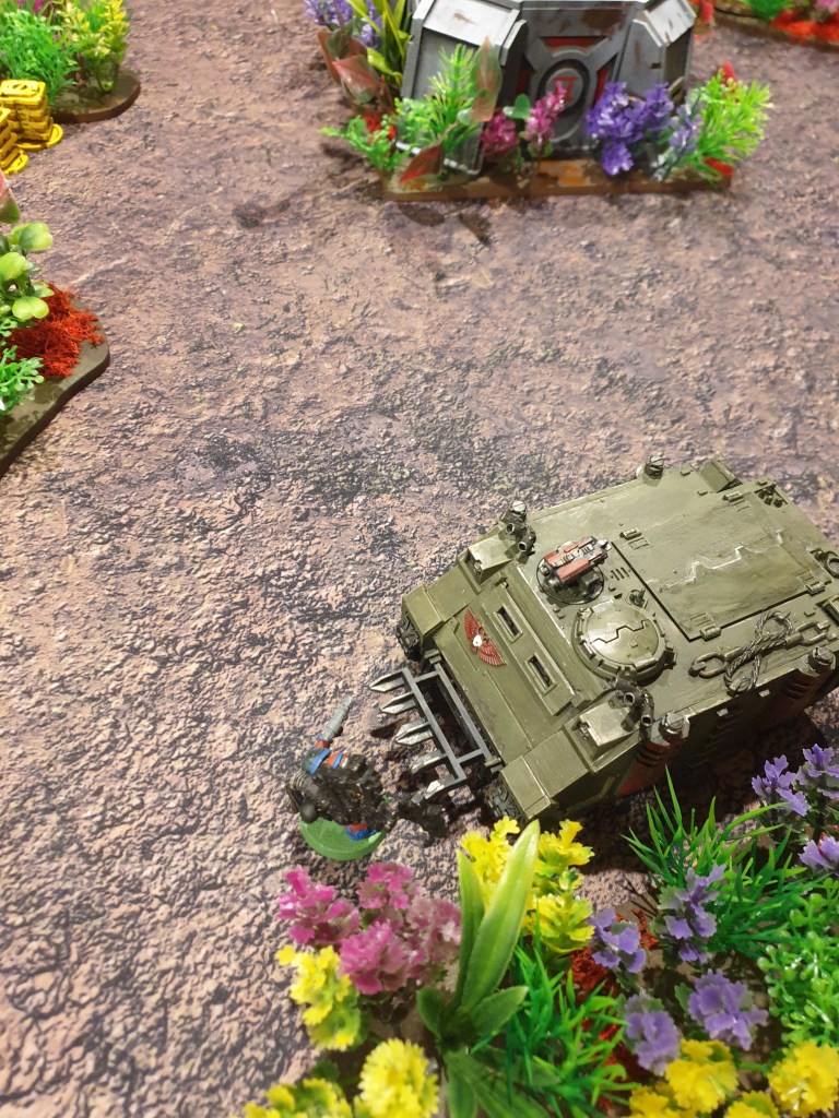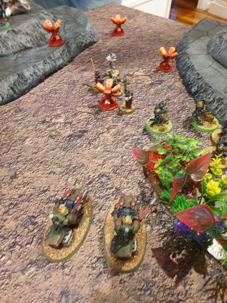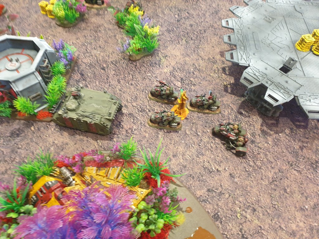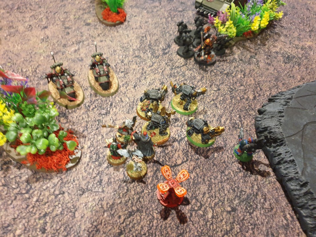 Greyfax’s force takes first turn. the bike squad redeploy next to the teleporter node while Forge’s rhino makes forward.