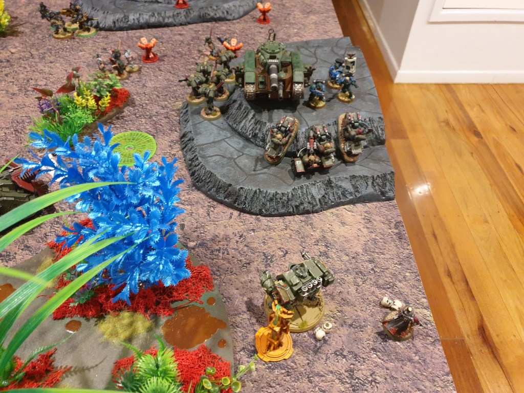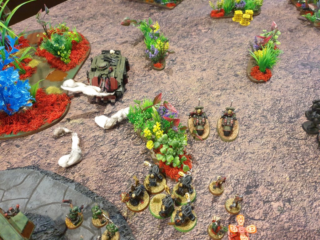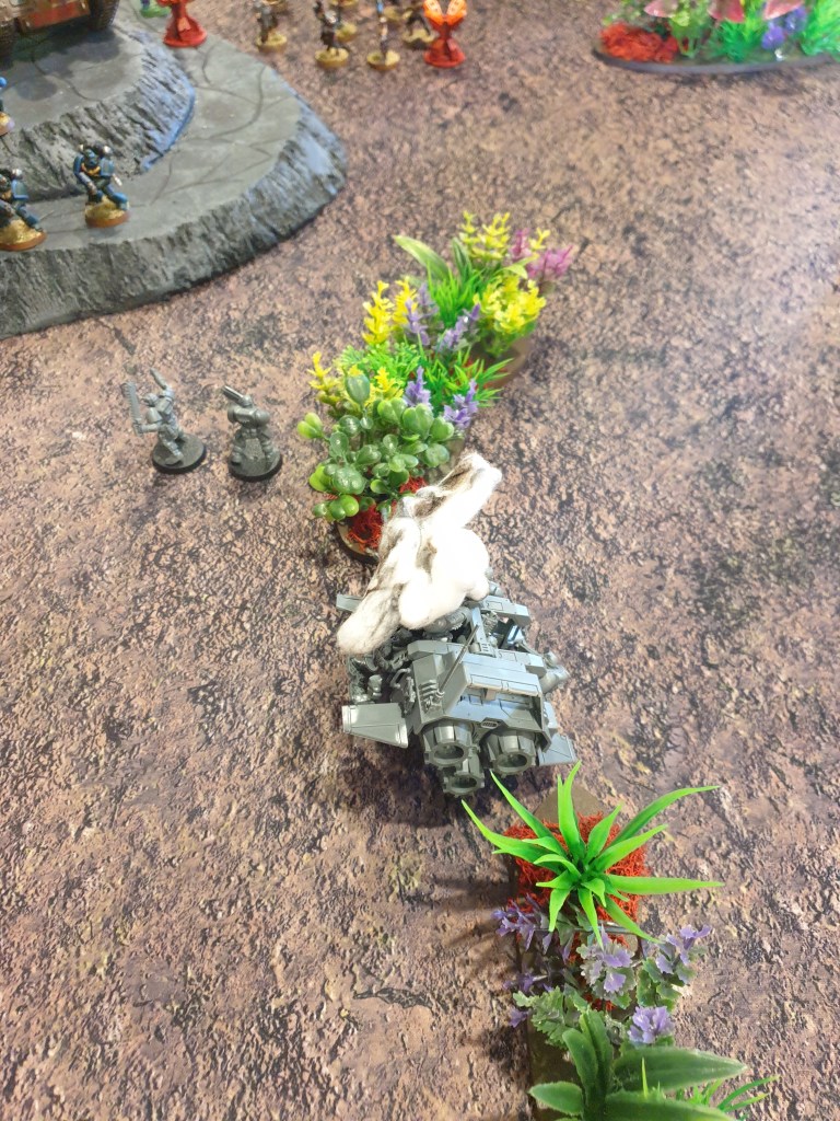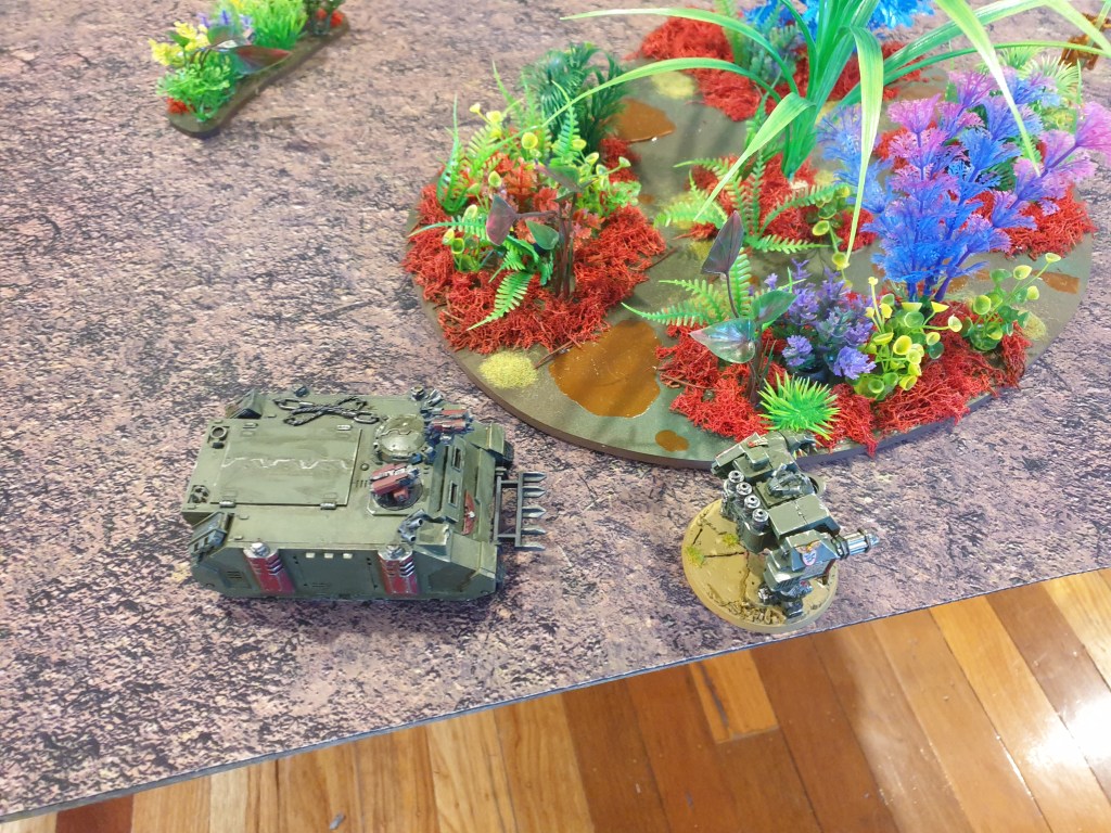 Using the jungle as cover, Greyfax’s rhino and the dreadnought move to assault the flank.