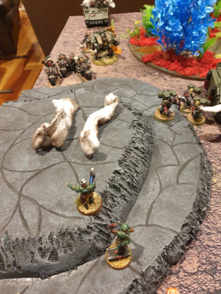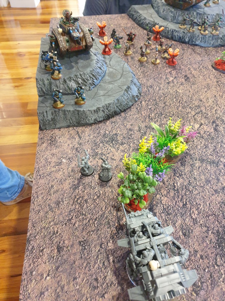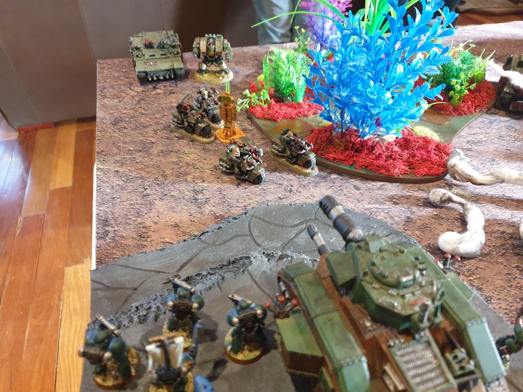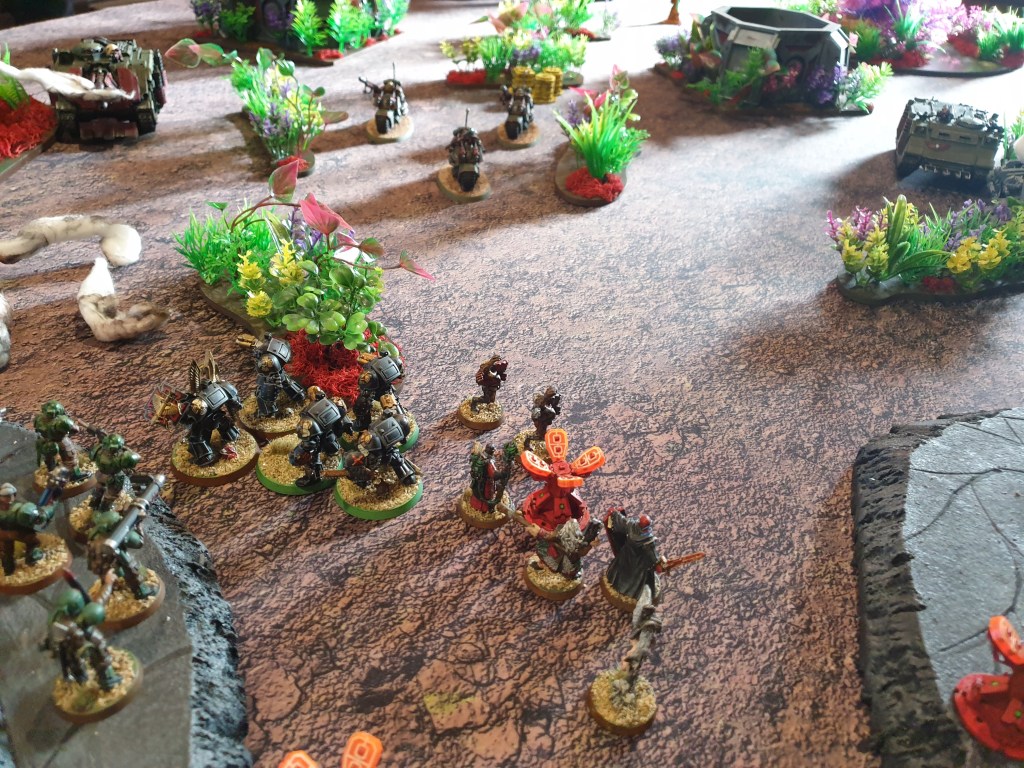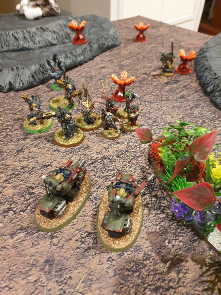 Using the jungle as cover, Greyfax’s rhino and the dreadnought move to assault the flank.